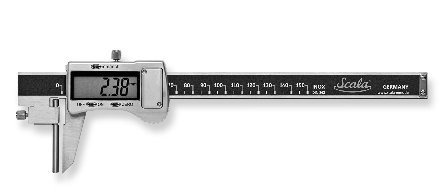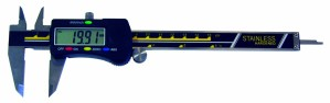 Digitális tolómérő, pontosság: 0,01 mm Jellemzők: • pontosság: 0,01 mmc • Csúszórész csavarral állítható • Mm/coll megjelenítés • Bármely helyzetben nullázható • 300 mm-ig kihúzható négyszögletes mélységmérő rúd • Kemény műanyag dobozban A max: 150 mm L: 235 mm B: 40 mm
