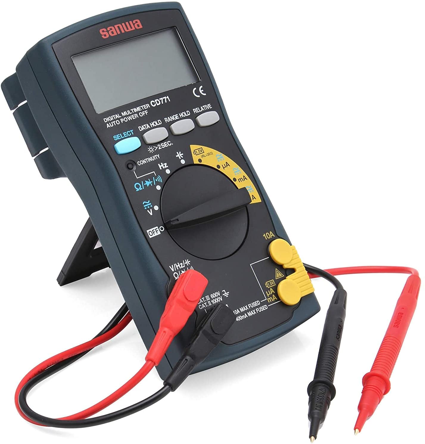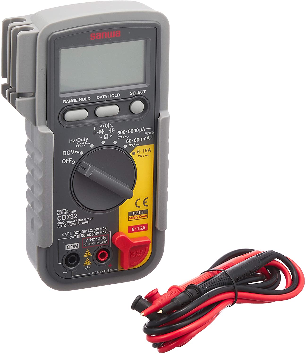 Nagy sebességű, 6000 kijelzéssel rendelkező multiméter, automatikus méréshatárváltással, analóg skálával. Praktikus védőtokban, falra akasztási lehetőséggel és kikapcsolható elemkímélési üzemmóddal. Feszültség: DC 300m/6/60/600/1000 ±(0,5%+2)/0,1mV (10-100MΩ) AC 6/60/600/750 ±(1,2%+5) 1mV (10-11MΩ) DCA 600μ/6m/60m/600m/6/15 ±(1,5%+3)/0,1μA ACA 600μ/6m/60m/600m/6/15 ±(1,8%+3)/0,1μA R: 600/6k/60k/600k/6M/60M ±(1,2%+3)/0,1Ω C: 40n/400n/4μ/40μ/400μ/4000μ ±(5%+6)/0,01nF F: 9,999/99,99/999,9/9,999k/99,99k ±(0,5%+3) Kitötlési tényező: 20-80% ±(0,5%+3) Szakadásvizsgálat: 10-60Ω kb 0,63V teszt feszültség Diódateszt: nyílthurkú feszültség: 2,7V Sávszélesség: 45-500Hz méret: 167x90x48 tömeg: 320g