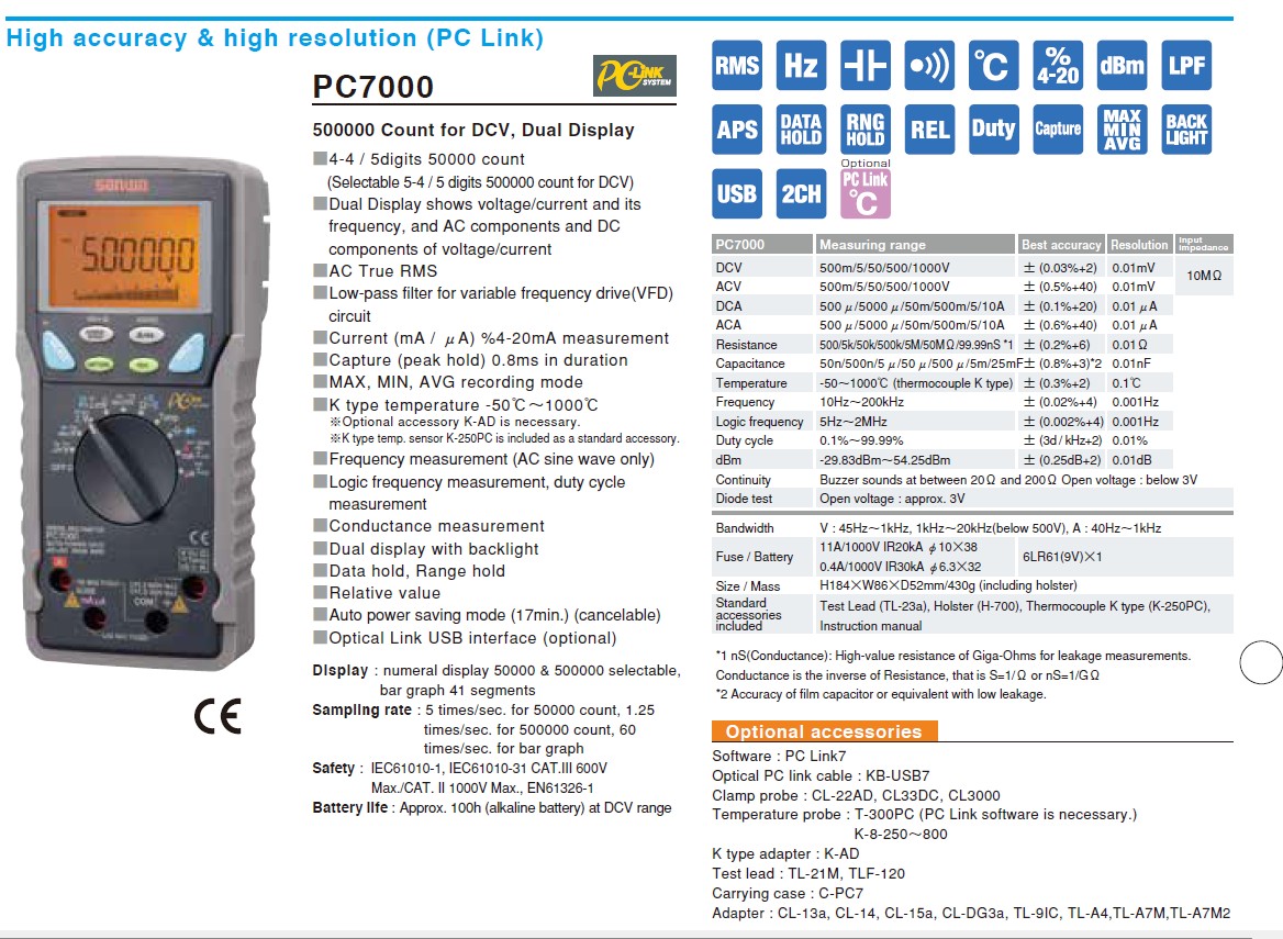 1000V/0,1mV AC/DC 10A/0,1μA AC/DC 50mΩ/0,1Ω 9999μF/0,01nF 200kHz/0,01Hz -200-1090°C/0,1°C -40°C-260°C 80BK mérőfejjel