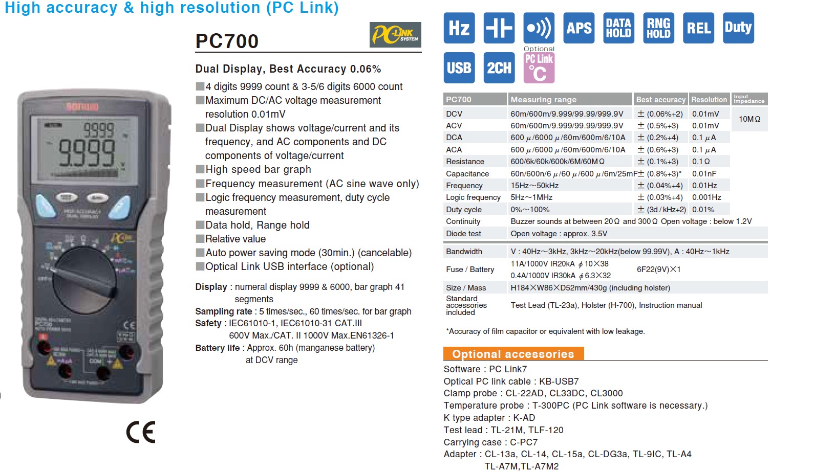 Kettős kijelző: 4 (9999) és 3,5/6 digit (6000), analóg skálával. PC-hez csatlakoztatható. DCV: 60m-999,9V ACV: 60m-999,9V DCA: 600u-10A ACA: 600u-10 R: 60M C: 60n-25mF logic f: 5Hz-1MHz Duty: 0-100% Kontinuitás (20R) és diódateszt (3,5V)