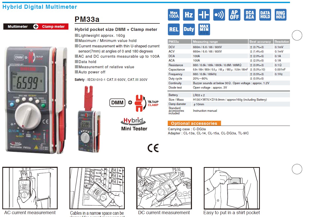 Hibrid multiméter és lakatfogós árammérő DVC: 660m-600V ACV: 660m-600V DCA: 100A ACA: 100A R: 66M C: 6,5n-66mF f: 66kHz Duty: 20-80% Kontinuitás (30R) és dióda teszt (3V)