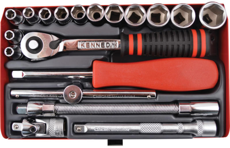 20 hatlapfejű dugókulcs és 5 tartozék készlet műanyag dobozban