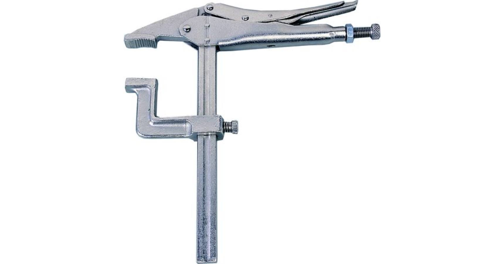Króm-vanádium c-fogó széles és mély pofaprofillal. Átlépi az akadályokat a szakaszok szilárd rögzítéséhez.