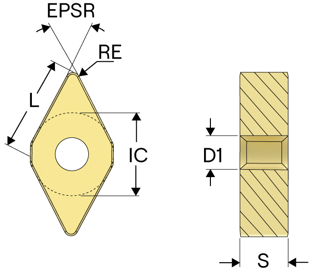 Alkalmazható anyag | Rozsdamentes acél | Erősen ötvözött hőálló acélok | Minőség TT9225 Alkalmazás | Ext 107.5° App 55° Diamond | Ext 62.5° App 55° Diamond | Ext 93° App 55°Diamond | Inserts | Int 100° App 70° Diamond | Int 107.5° App 55° Diamond | Int 93° App 55° Diamond | Int 93° App 70° Diamond | Int 93° App Back 55° Diamond | Int 95° App 55° Diamond | Min. fogásmélység 1 mm Corner Radius (RE) 0.8 mm Depth of Cut Maximum (APMX) 4 mm Cutting Edge Length (L) 15.5 mm Min. előtolás esztergálásnál (ft(min)) 0.17 mm/rev Insert Thickness (S) 6.35 mm Max. Turning Feed (ft(max)) 0.5 mm/rev Inscribed Circle Diameter (IC) 12.7 mm Forgácsolóél anyaga Carbide Test anyaga Carbide Bevonat TiCN+Al203+TiCN