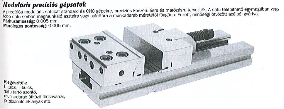 A precíziós moduláris satukat standard és CNC gépekre, precíziós köszörülésre és marózásra tervezték. A satu telepíthető egymagában vagy több satu sorban megmunkáló asztalra vagy palettára a munkadarab méretétől függően. E dzett, minőségi ötvözött acélból gyártva. Párhuzamosság: 0.005 mm. Merőleges pontosság: 0.005 mm. Kiegészítők: L-kulcs, T-kulcs, satu tartó szorító, munkadarab ütköző főcsavarral, pozícionáló ék-anyák stb.